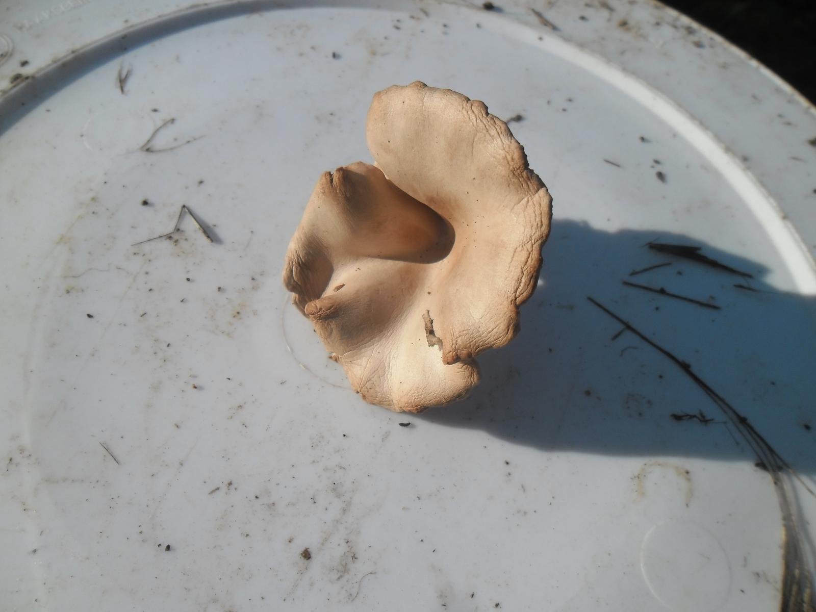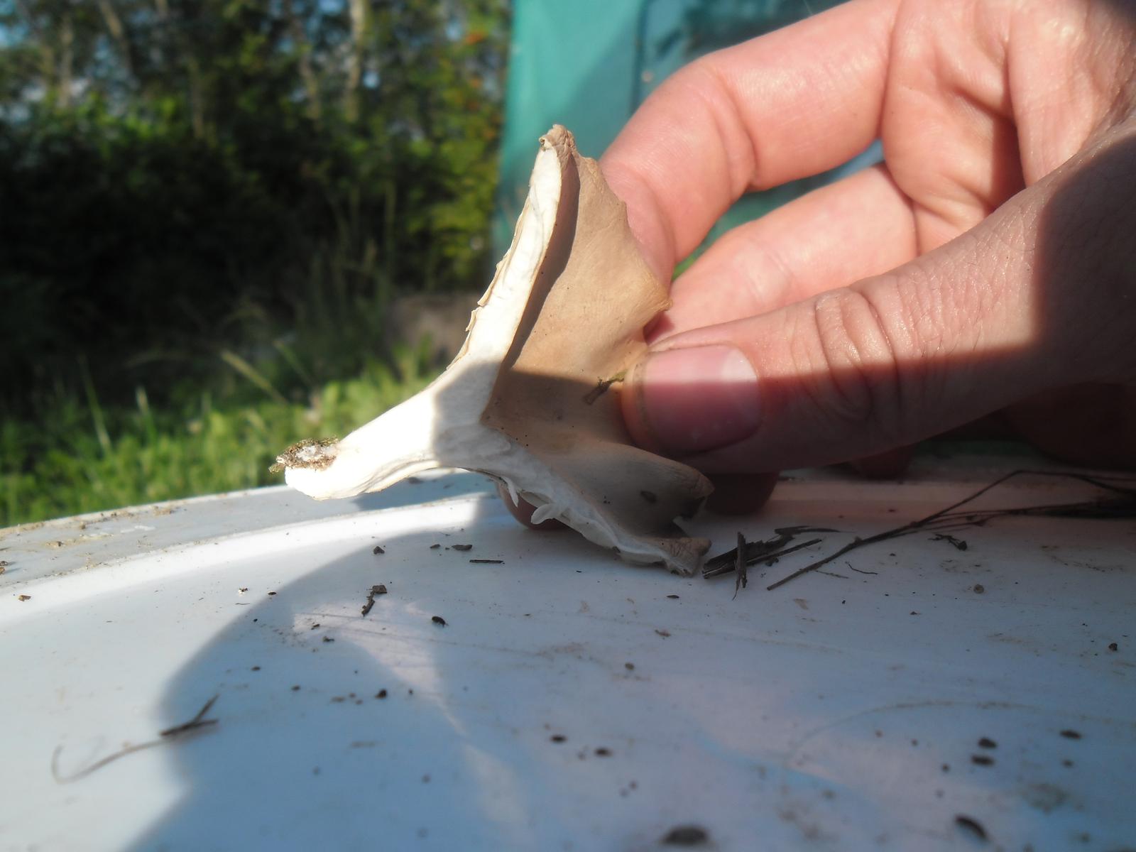 Es gibt keinen Buckel in der Mitte des Hutes, nichtmal im Ansatz. Der Hut ist Hellbraun, das Fleisch ist weis, die Lamellen sind hell cremefarben. Der Geruch ist angenehm Pilzartig.