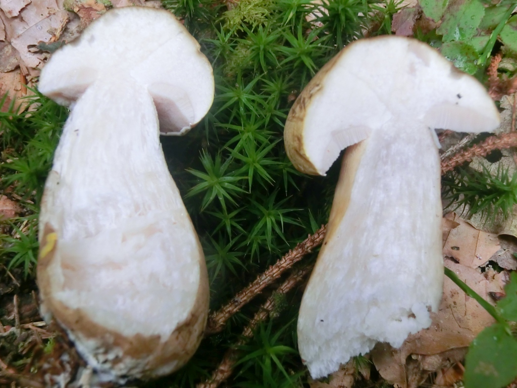 An einer Stelle (Tannen, Fichten und ein paar Laubbäume) an der auch Flockies und Steinpilze zu finden sind, fand ich einen Röhrling. Zuerst dachte ich an einen Gallenröhrling aber irgendwie konnte ich kein markantes Netz ausmachen. Der Geruch ist nicht so angenehm, deswegen wollte ich nicht kosten. Auf Druck auch keine große Veränderungen - vielleicht ein bisschen ins gräuliche, bin aber nicht so sicher. Könnt ihr mir weiterhelfen?
