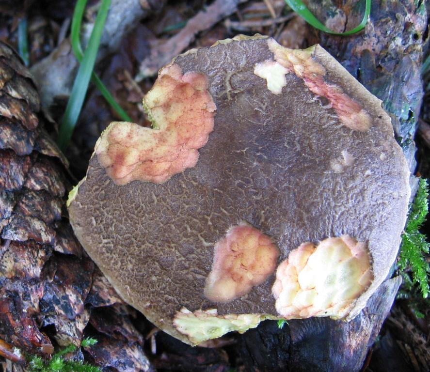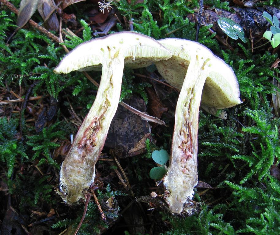 Hut/Röhren/Poren: Durchmesser (der Größte meiner Kollektion) 8,5cm, jung fast halbkugelig später etwas flacher konvex und felderig zerrissen, trocken, olivbraun, an Fraßstellen das rötliche unter der Huthaut durchschimmernd. Jung die Rohren intensiv gelb wie das Fleisch im Alter olivgrün, auf Druck grünlich verfärbend. Die Poren sind relativ groß, eckig, am Stiel ausgebuchtet und etwas herablaufend.