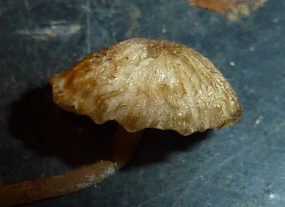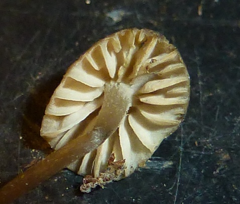Die Hutfarbe ist bei dem frischeren Exemplar eher dunkelbraun, das hellere scheint ausgebleicht. Leider ist mir der dunklere der beiden beim hantieren in die Nadelstreu gefallen und war unauffindbar. Daher kein ordentliches Foto von der Hutoberseite.