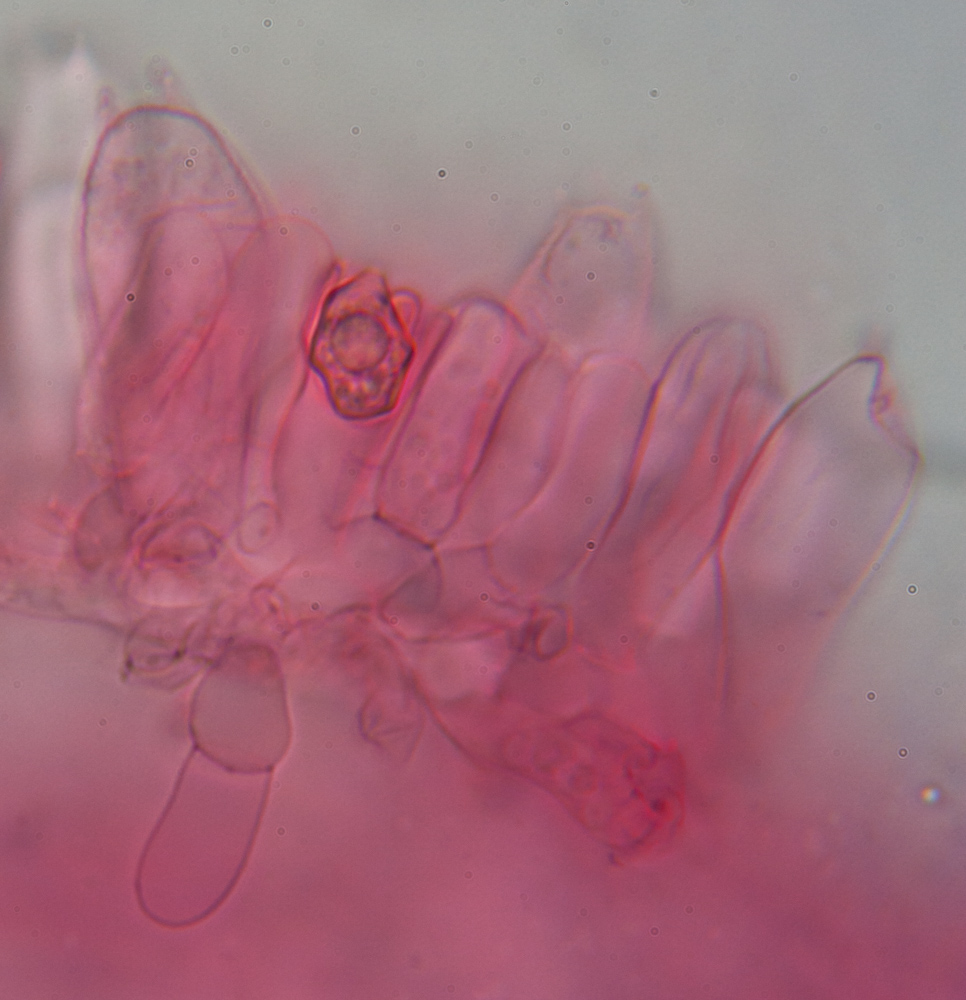 Sporen: 7-eckig (heterodiametrisch),11-12,5 x 6,5-7,5; MW 10,41 x 7,39 (wenn richtig gemessen bei den zackigen Teilchen); Basidien nur 2-sporige gesehen ?
