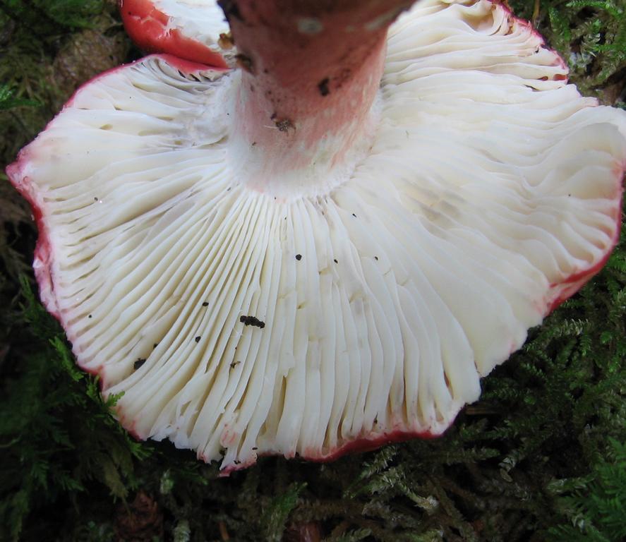 Lamellen: hell, bis ganz leicht gelblich durchschimmernd, viel später leicht rostig fleckig, an Rand rötlich, einige zum Stiel gegabelt, abgerundet angewachsen, dicht stehend.