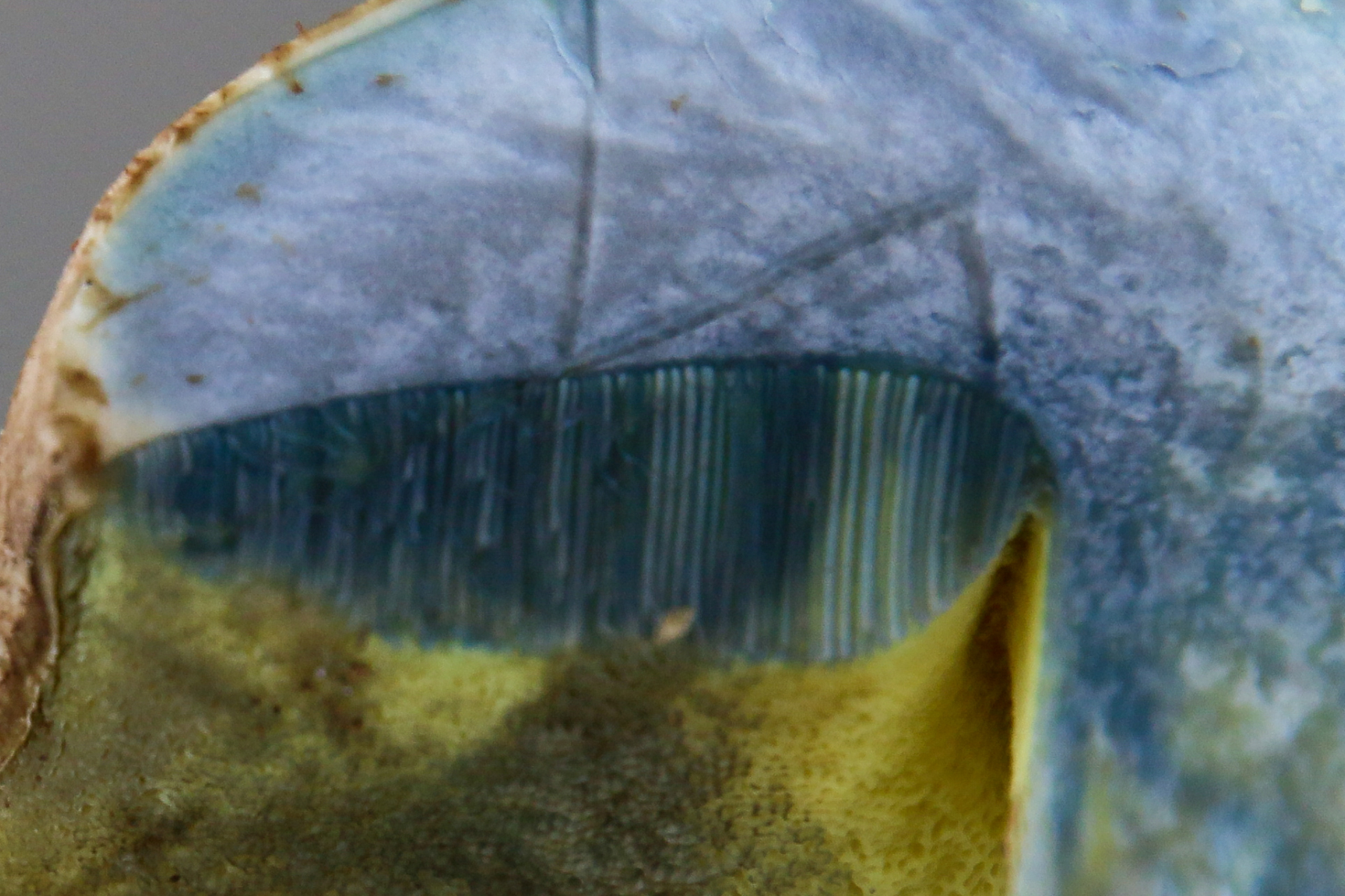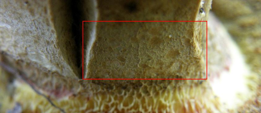 Röhren: gelb bis oliv, bei Verletzung blauend; Poren gleichfarben, fein, auf Druck blauend; im Alter vor allem bei trockener, heißer Witterung auch rostrot überlaufen