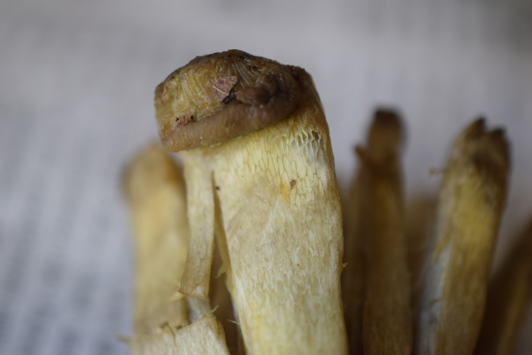 Stiel: meist kurz, kräftig, jung bauchig bis keulig, im Alter auch keulig bis zylindrisch; Stielbasis gerne etwas spindelig verjüngt bis wurzelnd; Oberfläche gelblich, vor allem an der Stielspitze oft kräftig leuchtend gelb, darunter blasser, von der Stielbasis her grau bis graubraun überlaufen, gelegentlich auch mit rötlichen Pünktchen oder Bändern; Stielnetz fein bis deutlich, gelblich oder gelbbraun, oft nur im oberen Stieldrittel erkennbar, im Alter teilweise vergänglich und dann kaum noch zu sehen; Stieloberfläche jung auf Druck blauend