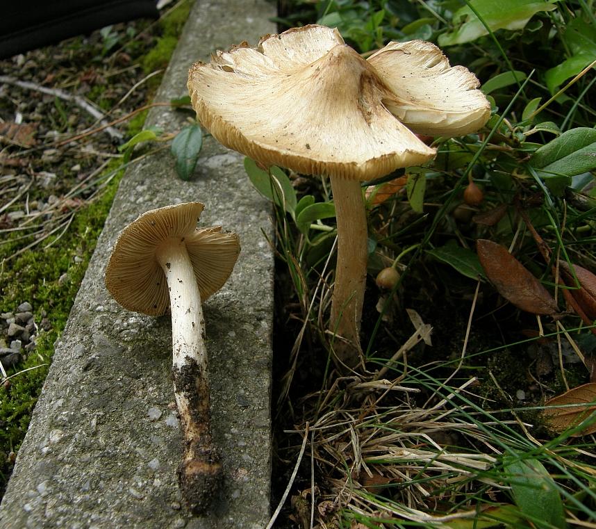 Die Pilze wuchsen teils im weichen Boden eines Grabes, teils ziemlich eingesenkt, andere pressten sich zwischen einem Stein und dem Kiesweg aus dem Boden. Ich nehme an, daß darum die Knolle nicht so richtig dick werden wollte.