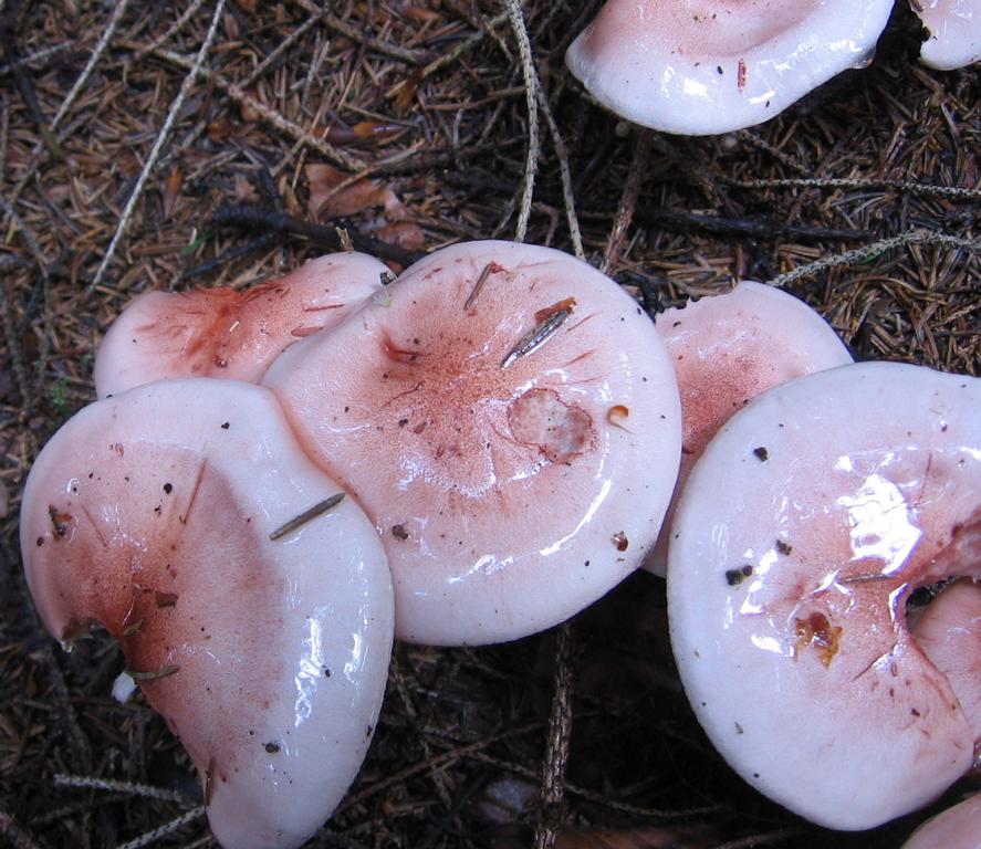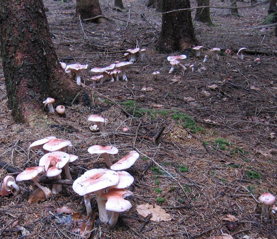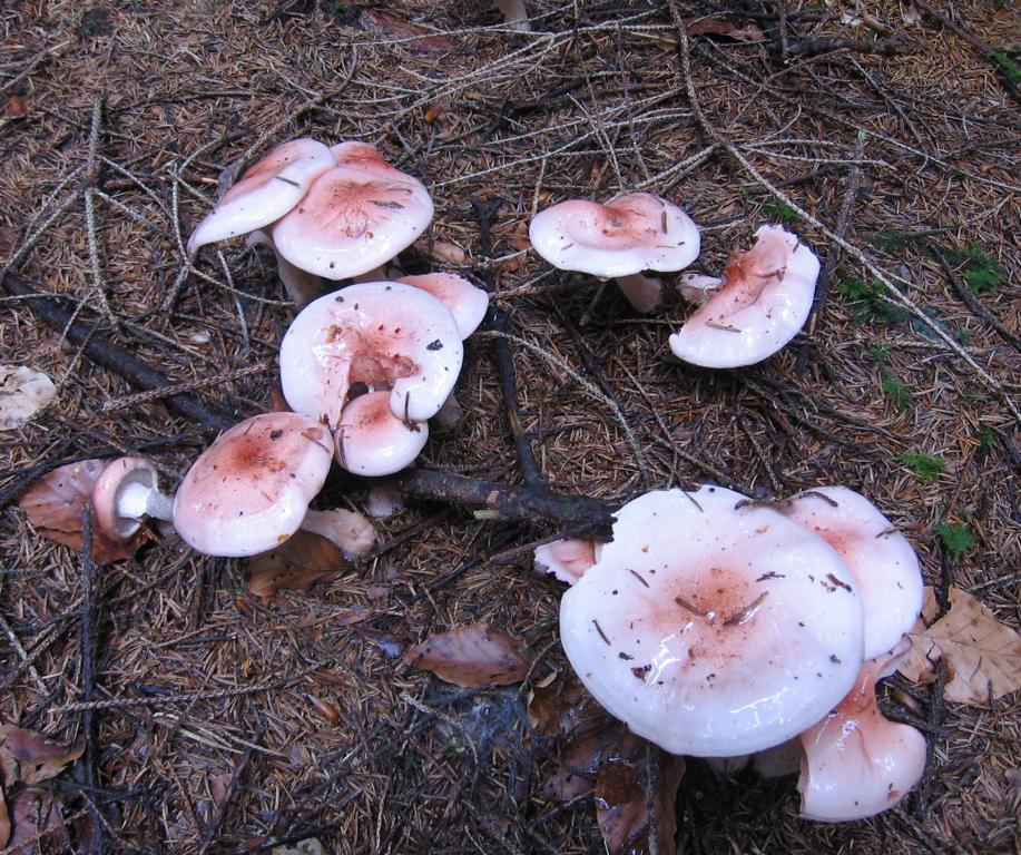Hut: Durchm., die größten um 10cm, äußerst schleimig, vom Rand her zart rosa zur Mitte ansteigend, im Zentrum kl. rote Pünktchen. Hh etwas überstehend, schwierig in Fetzen ablösbar, Fraßstellen ebenfalls rosa.