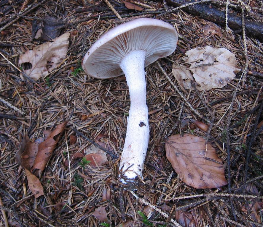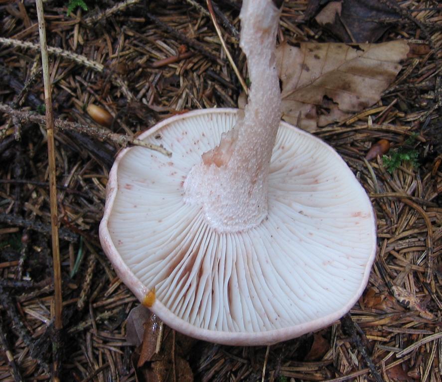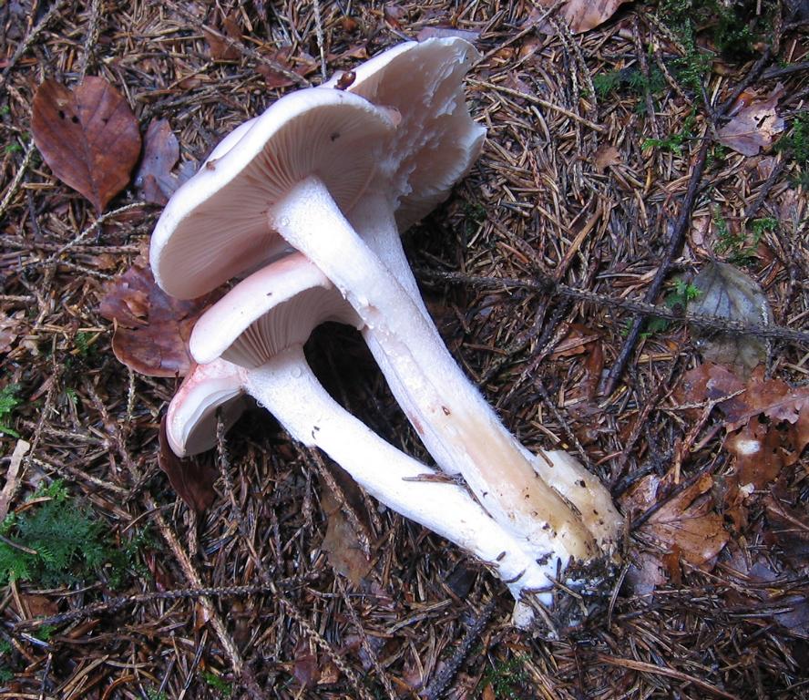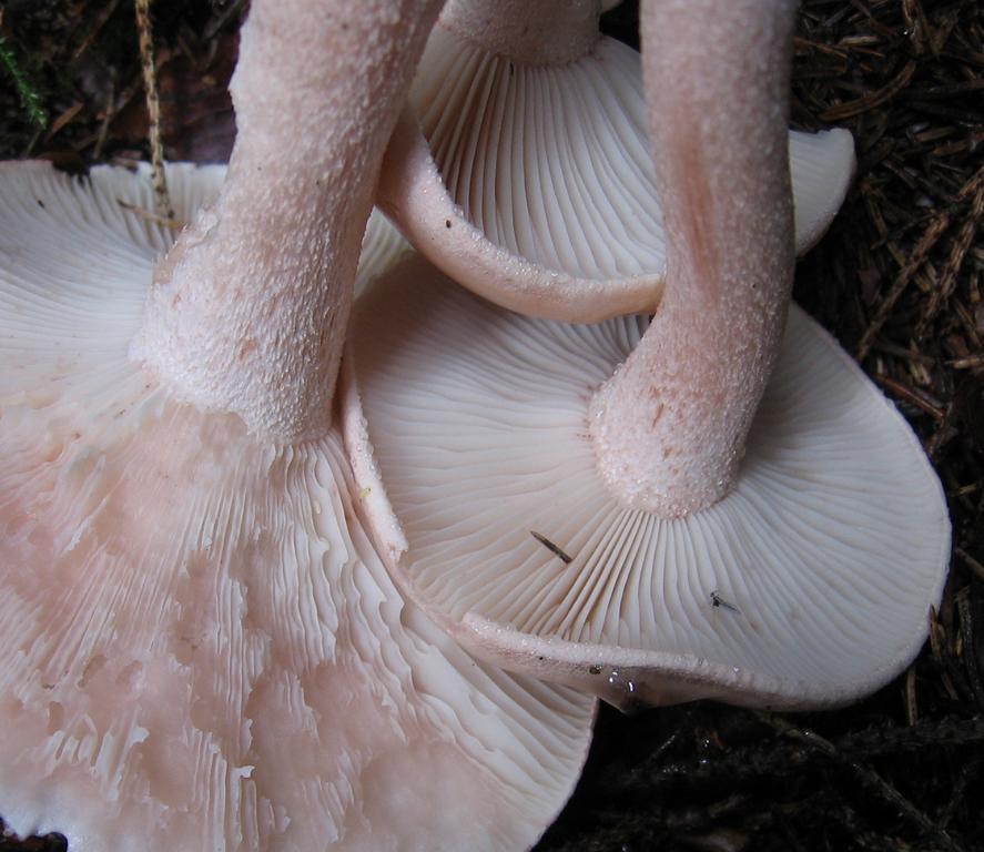 Stiel: um 9 x 1,5-2cm, Wassertröpfchen unter den Lamellen, weiß flockig, auch etwas rötlich, einige an der Basis verwachsen, etwas spitz zulaufend, voll.