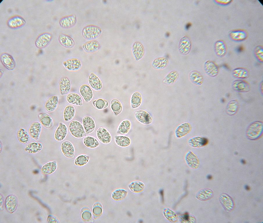 Sporen: ellipsoid, glatt, teilw. mit großem Tropfen und seitl. Appendix, 7-9,5 x 4,5-6,5 µm; MW 8,37 x 5,60 µm.