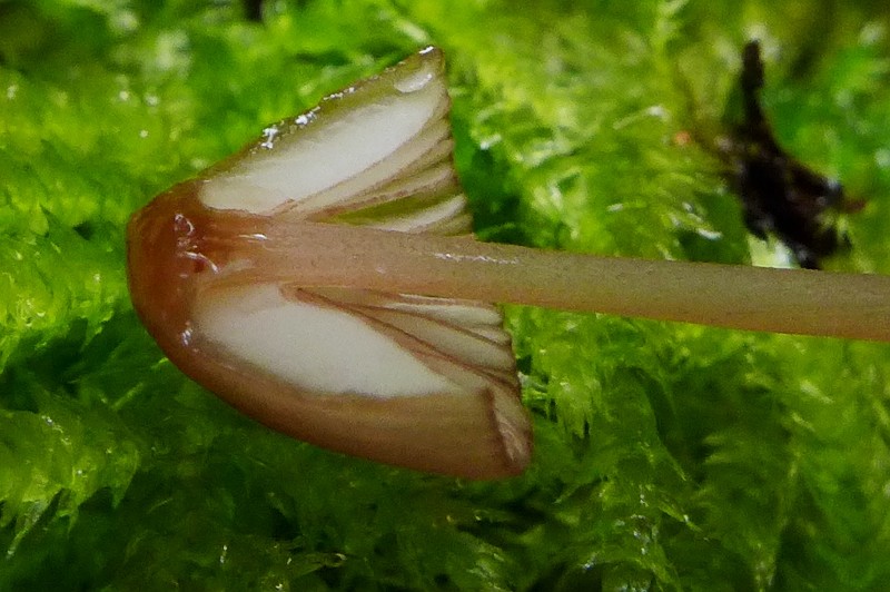 Zweite Möglichkeit (im Bon gefunden): Nitrat-Helmling , Mycena capillaripes (ohne Milch, leicht rötliche Schneiden, mit Geruch), soll auch im Nadelwald sein - wird aber "unterschiedlich interpretiert". Ein Bild von vielen sieht ähnlich aus, aber das ist auf commanster.eu