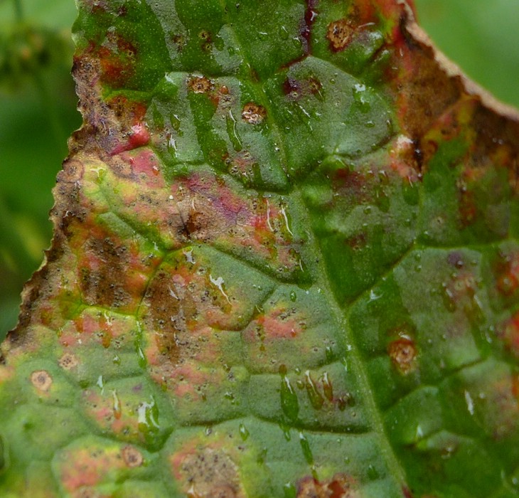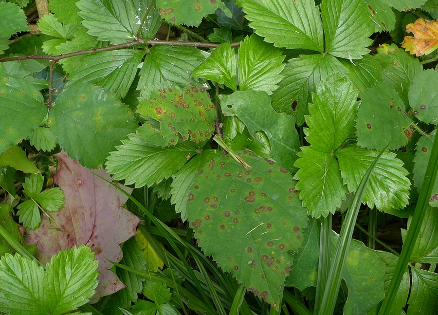 15 Eine Brombeere die mit dem Rostpilz Phragmidium violaceum befallen ist. Den Namen hat der Pilz von den kreisrunden, rotvioletten Flecken die er blattoberseits verursacht.