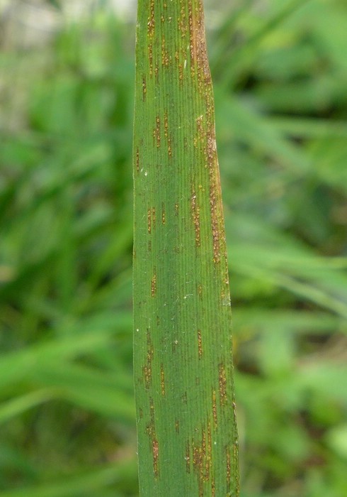 17 Der Rostpilz Puccinia brachypodii an der Wald-Zwenke (Brachypodium sylvaticum). Typisch sind die recht kleinen, reihig angeordenten Uredien.
