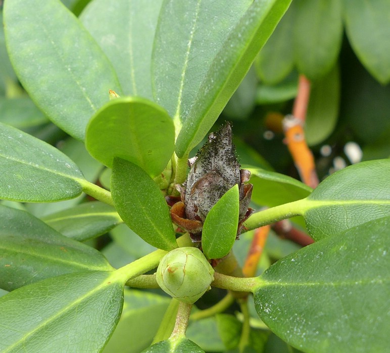 33 Natürlich waren die Rhododendron-Knospen im Park durch Pycnostysanua azaleae, die Rhododendron-Knospenfäule befallen.