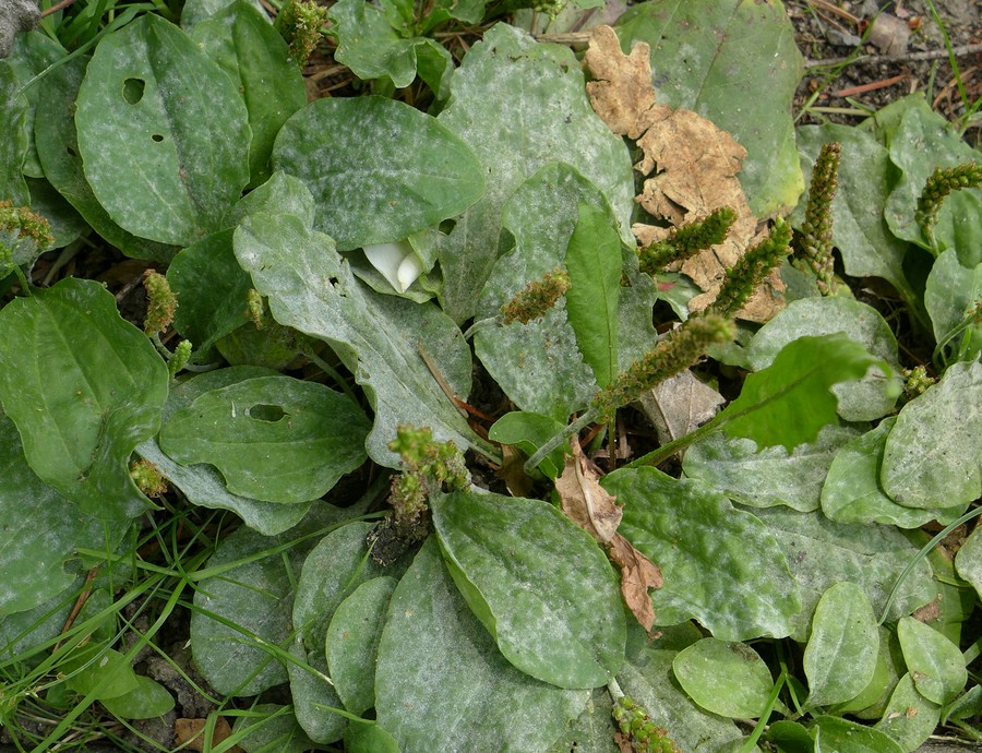3 Der Echte Mehltaupilz Golovinomyces sordida am Breit-Wegerich (Plantago major)
