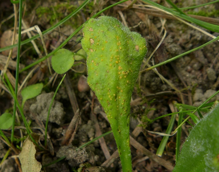 36 Am Hang waren dann Blätter von einem Veilchen mit dem Rostpilz Puccinia violae befallen (Uredien)