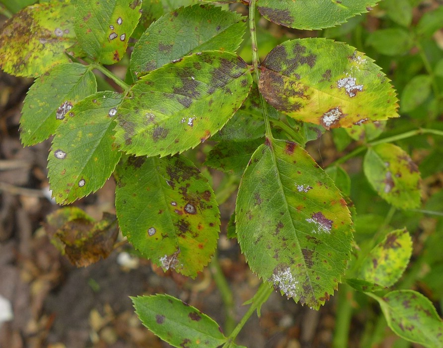 5 Fleckenartig das weiße Myzel vom Echten Mehltaupilz Podosphaera pannosa auf einer Zier-Rose (Rose cult.)