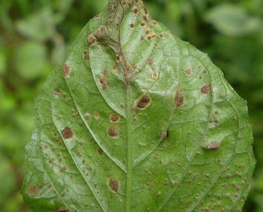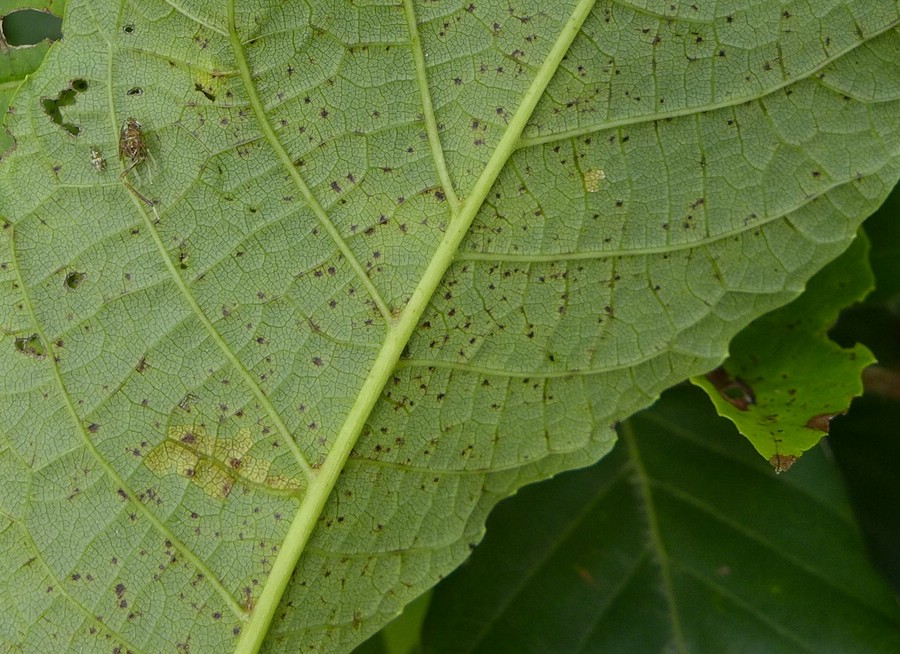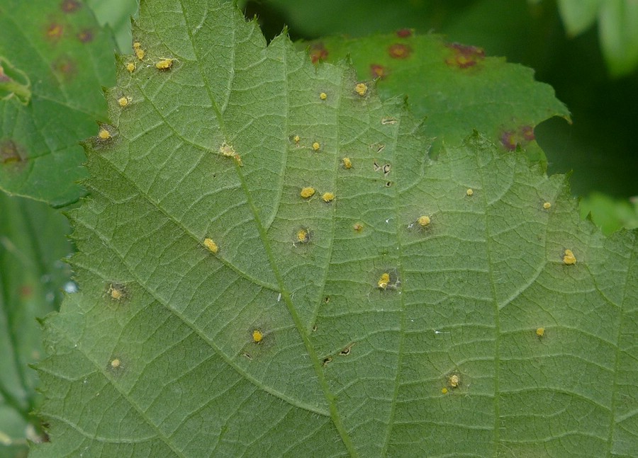 25a In dem gleichen Bestand standen auch wenige Blätter herum, die mit dem Brandpilz Entyloma microsporum befallen waren. Der Pilz ähnelt Gallen, da er kleine Erhebungen an den Blättern hervorruft.