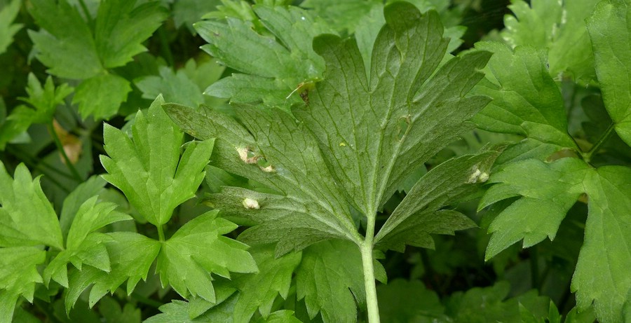 24 Am Wegrand stand dann viel Kriechender Hahnenfuß (Ranunculus repens) der gleich zwei Kleinpilze aufwies. Die weißlich bepuderten Blätter sind mit dem Echten Mehltaupilz Erysiphe aquilegiae var. ranunculi befallen, die gelblich verfärbten Blätter durch den Ascomyceten Leptotrochila ranunculi.