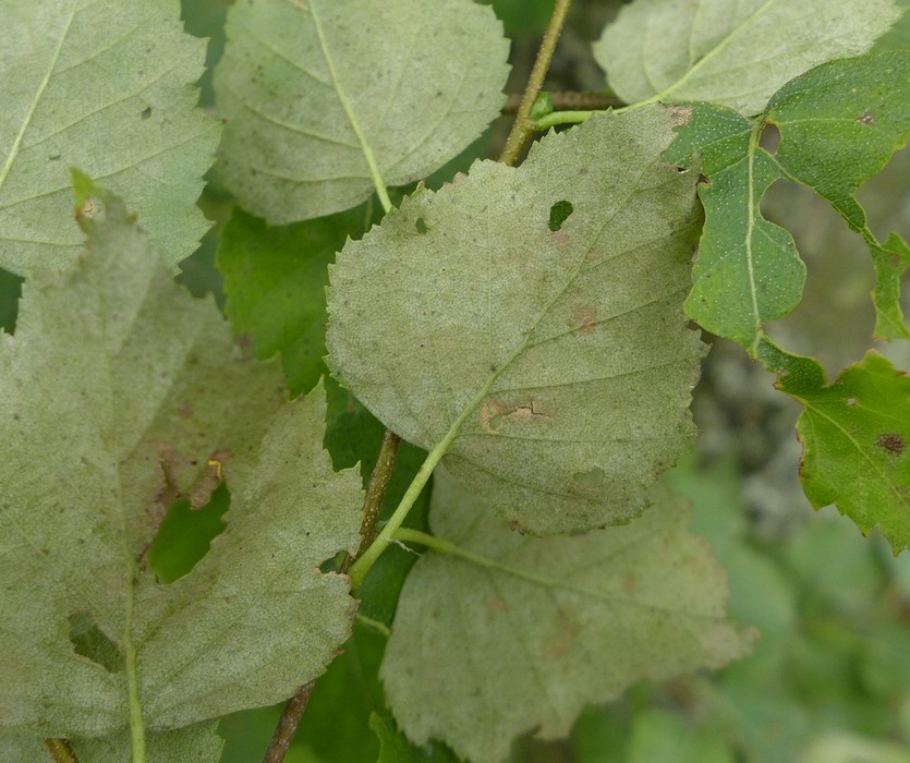 30 Beim Umdrehen der Blätter der Birke (Betula pendula) sah man auch schon das Myzel von dem Echten Mehltaupilz Phyllactinia betulae. Dieser Pilz fällt später im Herbst durch seine sehr großen Chasmothecien auf.