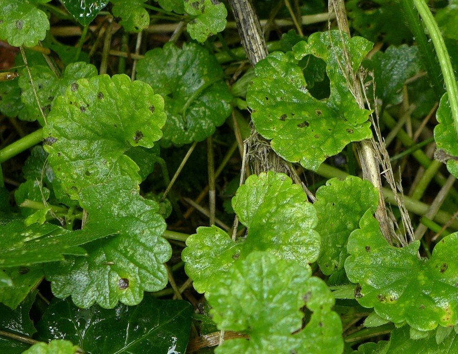 40 Einer der häufigsten Rostpilze durfte natürlich auch nicht fehlen. Puccinia glechomatis auf dem Gundermann (Glechoma hederacea). Hier schön an den gelben Flecken blattoberseits zu sehen.