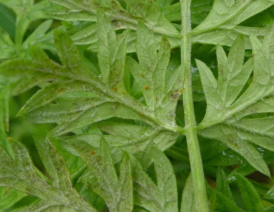 41 Der am Parkplatzrand stehende Wiesen-Kerbel (Anthriscus sylvestris) war gleich mit zwei Pilzen befallen. Einmal das weiße Myzel vom Echten Mehltaupilz Erysiphe heraclei und dann noch der Rostpilz Puccinia chaerophylli im Uredostadium.