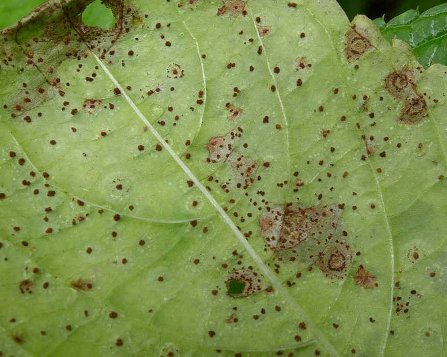 20 Auf Brombeere können mehrere Rostpilz vorkommen. Hier eine Doppelinfektion mit dem vorher gezeigten Phragmidium violaceum mit dem Rostpilz Kuehneola uredinis, welcher hier oberseits diese kreisförmigen Lager verursacht.