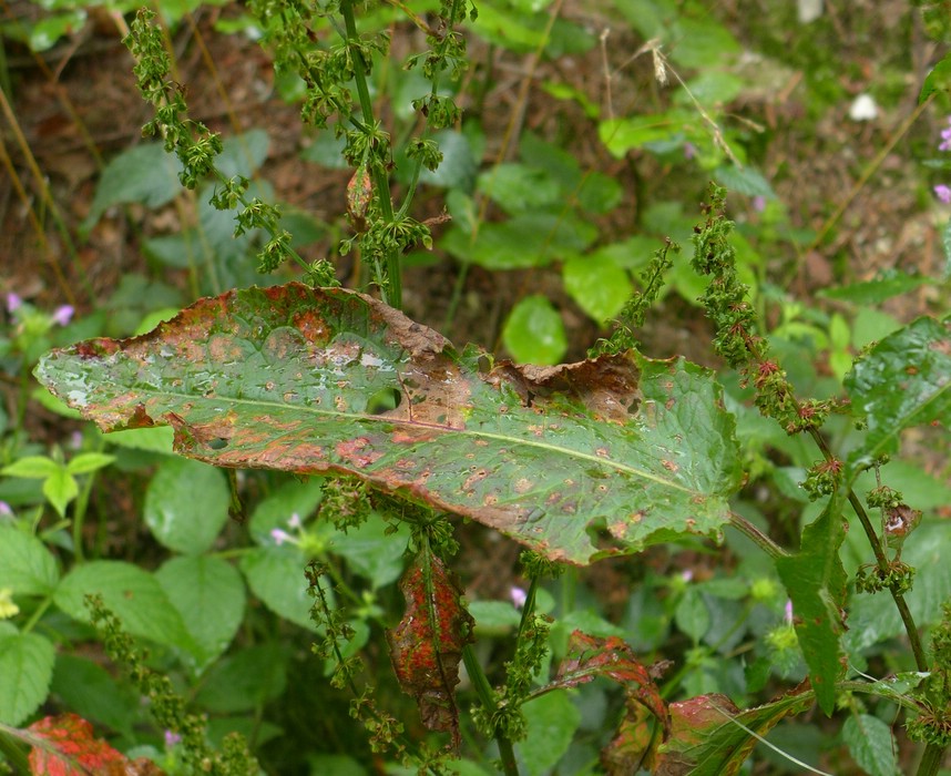 47 Am Wegrand stand dann noch infizierter Stumpfblättriger Ampfer (Rumex obtusifolius) herum. Die kleinen schwarzen Lager blattoberseits gehören zu dem Ascomyceten Venturia rumicis.