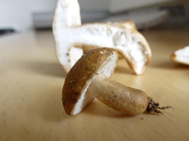 ok ich lös dann mal auf. ;) Meine Marone ist natürlich keine. Das ganze war nur ein Spaß. Das ist ein ziemlich seltener Röhrling (Hasenröhrling; Gyroporus castaneus) erkennbar am hohlen Stiel, dem weißbleibenden Fleisch im Schnitt und dem zimtfarbenen Hut und Stiel. Deswegen wird der auch Zimtfarbener Röhrling genannt. Mausmann spielt mit seinem Milchreisspruch darauf an.