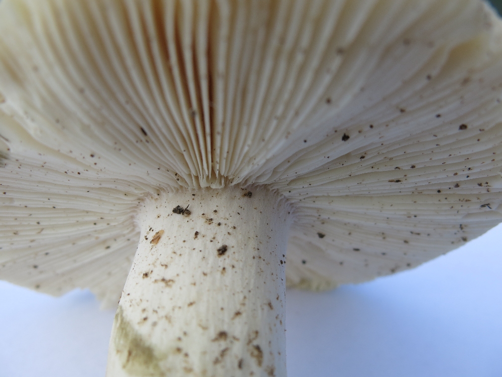 am stielansatz, farbe und ausprägung der lamellen.