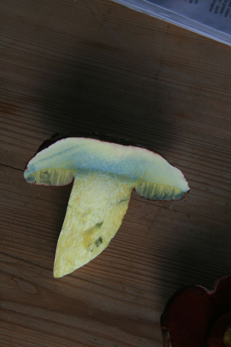 Hutfarbe ist schwer zu beschreiben (graugelbrot oder so...), blaut beim Anschnitt nur wenig (auf den Fotos ist der Zustand etwa 1min nach dem Anschnitt zu sehen), kein unangenehmer Geruch.