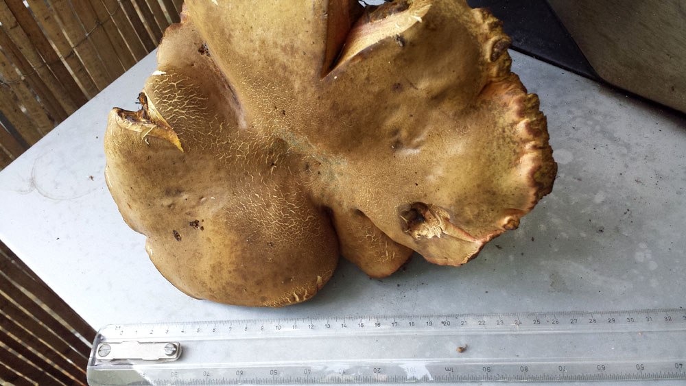 ich habe heute beim Spaziergang mit dem Hund einen gigantischen Röhrenpilz gefunden. Jemand hatte ihn quasi umgeschubst, deshalb hab ich ihn einfach so im ganzen mitgenommen. Der Hut ist mittelbraun, trocken und relativ glatt, der Stiel cremefarben und mit einem deutlichen Netz überzogen. Das Futter ist naja, ich würde sagen oliv-gelblich, vielleicht war es auch mal orange. Aber das ist schwer zu sagen, da der Pilz stark blauend und eben schon sehr groß ist. Das gute Stück wiegt etwas über 900g und hat einen Durchmesser von knapp 30cm (s. Foto). Bei so einem Riesenkerl fällt mir die Bestimmung aber sehr schwer. Ich würde auf einen netzstieligen Hexenröhrling tippen, bin aber gar nicht sicher. Was sagt Ihr?