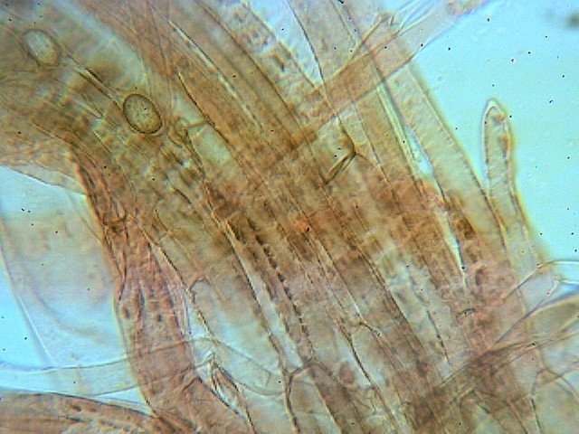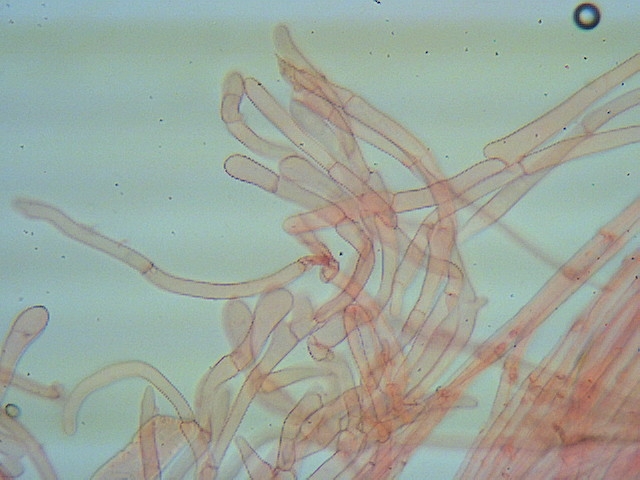 Hyphen der äußeren Stielbekleidung 4 - 9 µm breit, keine Kaulozystiden, abstehende Endzellen bis 10 µm breit. 400 fach