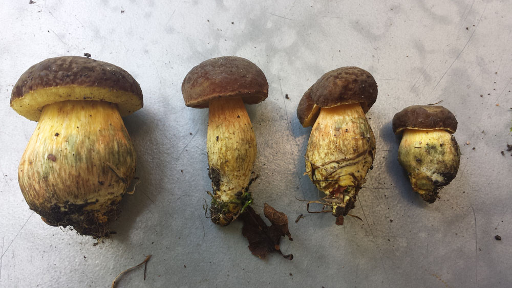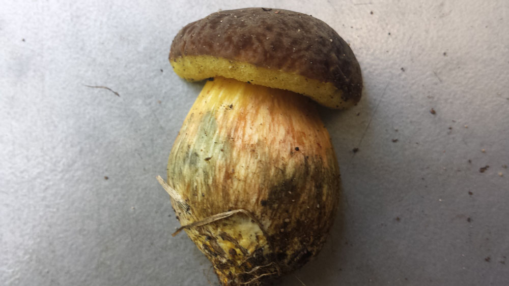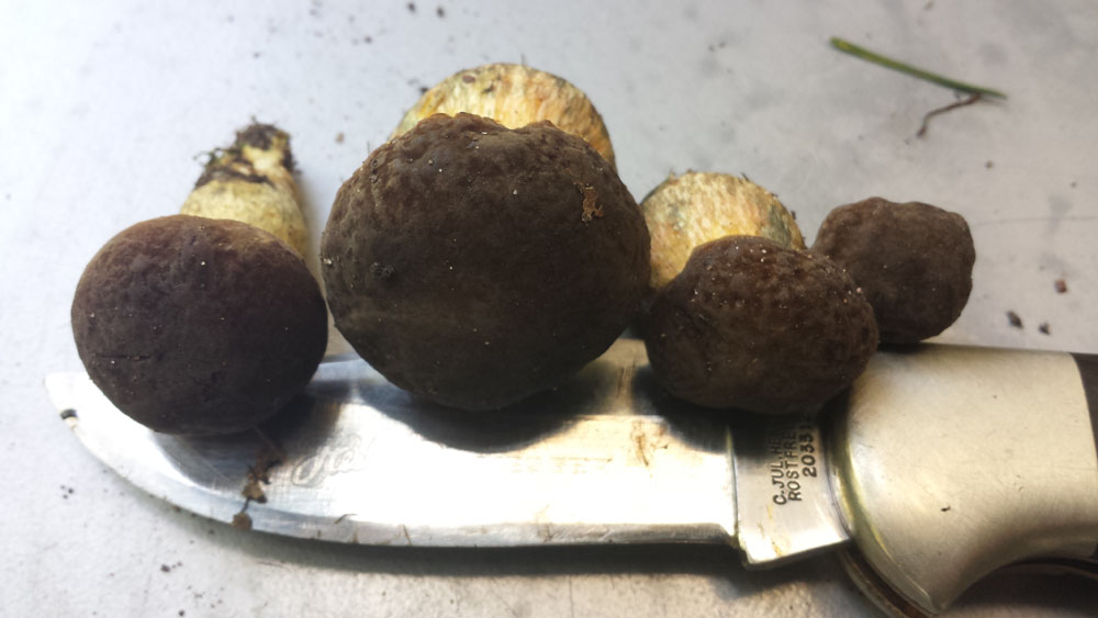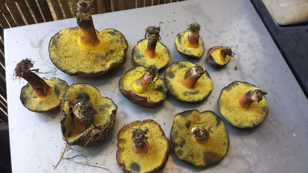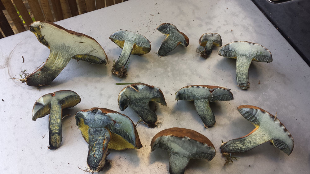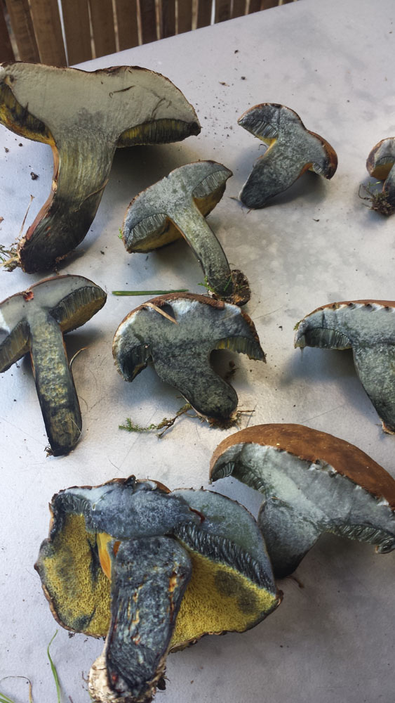 Grade im Park zwei unterschiedliche Sorten Röhrlinge gefunden. Da ich nicht damit gerechnet hatte, stand mir für den Transport nur ein (unbenutzer!) Hundekackbeutel zur verfügung, daher ziemlich viele Druckstellen... ich denke das eine könnten flockstielige Hexenröhrlinge sein, weil sie im Schnitt SOFORT blau angelaufen sind. Aber da bin ich weit weg von sicher. Gefunden auf dem Rasen unter einer Art Ahorn. Ich denke irgendeine asiatische Sorte. Eiche und Esche ganz in der Nähe. Das andere halte ich auch für einene Art Hexe, aber weiß nicht so recht was für eine. Der Stil sieht im Anschnitt irgendwie "unordentlich" aus. Nicht ganz so stark blauend wie die ersten. Gefunden hab ich die auch auf dem Rasen aber unter einer Rosskastanie.
