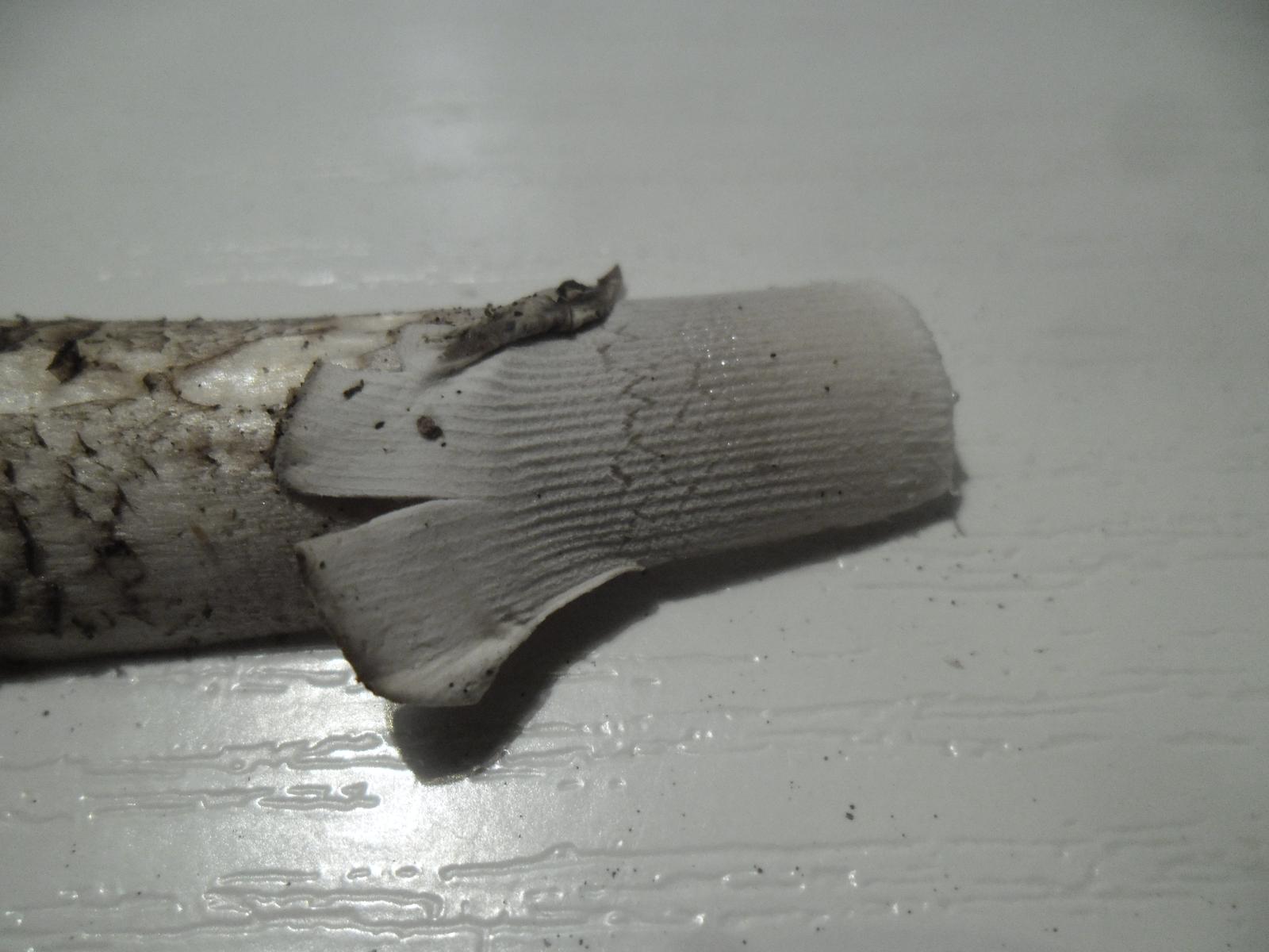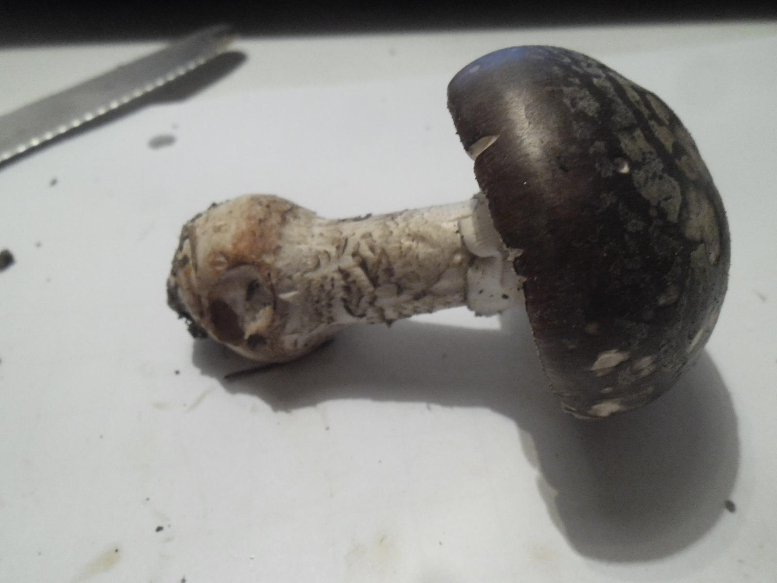 Der Hut ist Braun-Grau und hat hellgraue Flocken. Fleisch und Lamellen sind weis. Er riecht scharf nach Wald, vielleicht auch nach Rettich. Am Stiel sind braune Schuppen.Die Haut lässt sich in Fetzen vom Hut abziehen. Der Schleier ist geriffelt und fängt am Hut an.