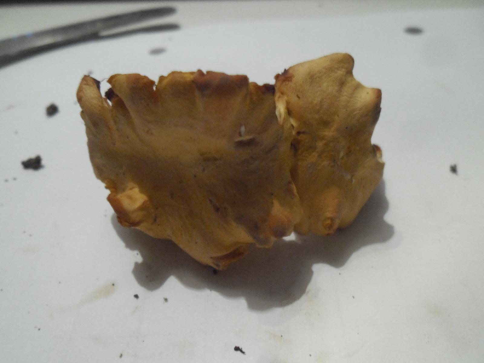 • Dass die Farben so komisch rüberkommen, liegt daran, dass das Bild unterbelichtet ist. Ansonsten wäre klarer, dass es sich um einen normalen, vielleicht nicht mehr ganz frischen Pfifferling handelt.