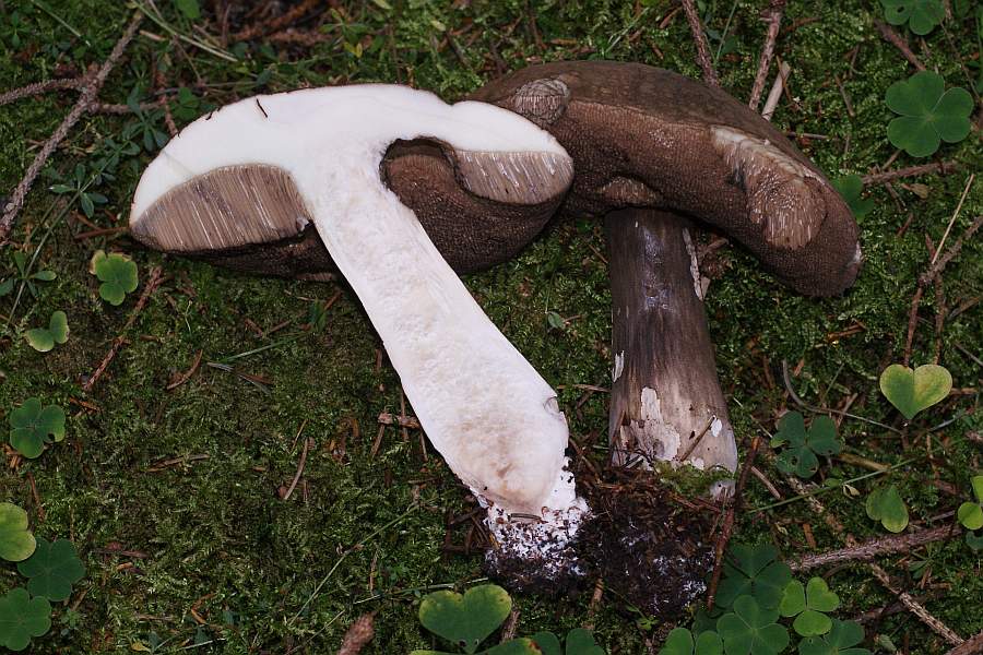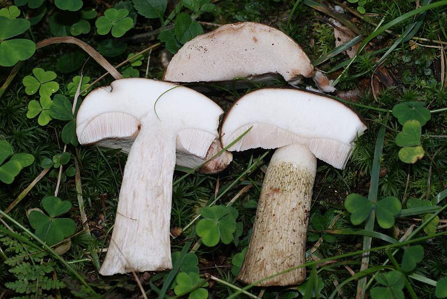 Bei diesem Exemplar bin ich mir sicher, dass es sich um einen Gallenröhrling handelt: die rosafarbenen Röhren und das Netz am Stil sprechen dafür. Rechts ein reichlich überaltertes Exemplar.