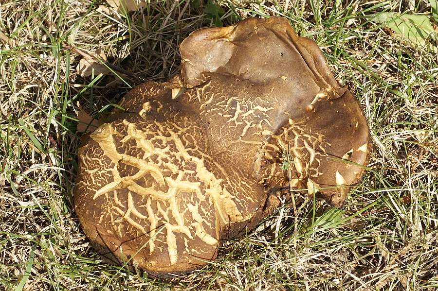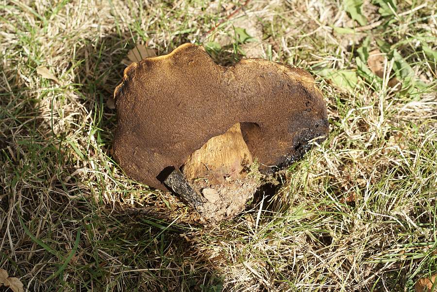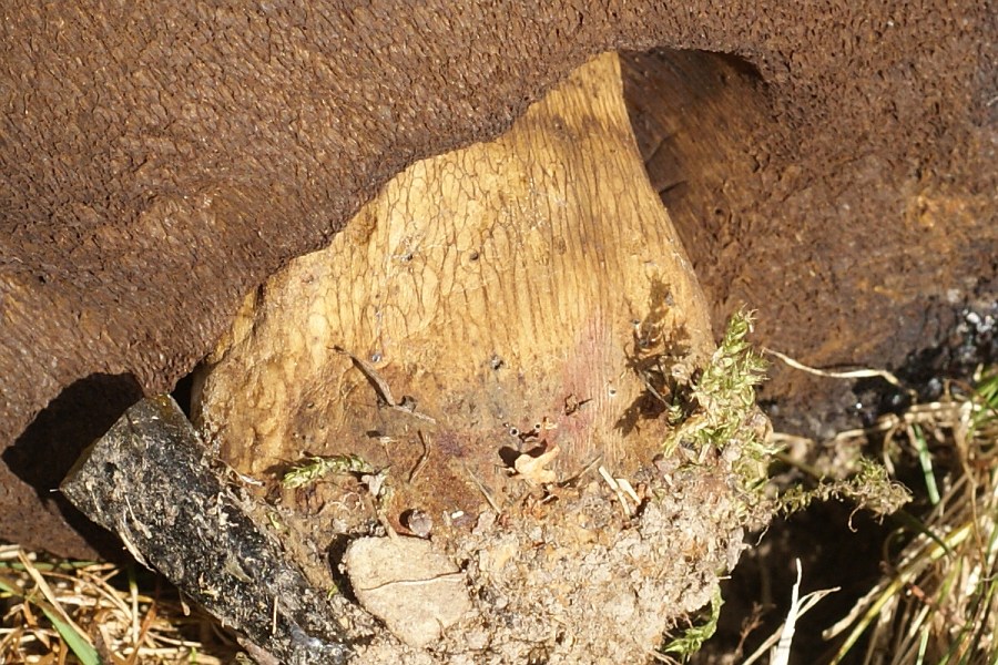 Im gleichen Wald fand ich dann noch diesen Röhrling, den ich absolut vorschnell als Gallenröhrling eingestuft habe. Das kann aber nicht stimmen. Es gibt allerdings auch nur dieses eine Foto. Stilfleisch sehr fest bis hart, bis unter den Hutrand grob genetzt. Hut dunkel feinfilzig wie bei der Marone, Röhrenausgänge gelb, Röhrenöffnungen weit. Gesamthöhe ca. 7 cm, also relativ klein. Stilfleisch im Schnitt leicht rosa anlaufend, ebenfalls leichte Verfärbung unter der Huthaut. Möglicherweise wichtig: in der Nacht zuvor könnte es leichten Frost gegeben haben, es war am Abend zuvor um 21:00 Uhr nur noch 4 Grad.