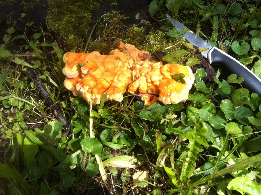 seitdem mein Freund und ich angefangen haben, haben wir immer nach dem "Chicken of the Woods" ausschau gehalten. Heute auf dem Weg zur Uni habe ich etwas genau vor unserer Tuer gefunden und konnte meinen Augen nicht trauen.