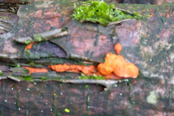 könnte eine Zinnoberrote Tramete draus werden. Oder es ist ein Orangroter Kammpilz (Phlebia radiata), aber ich glaube der kommt erst im Herbst vor