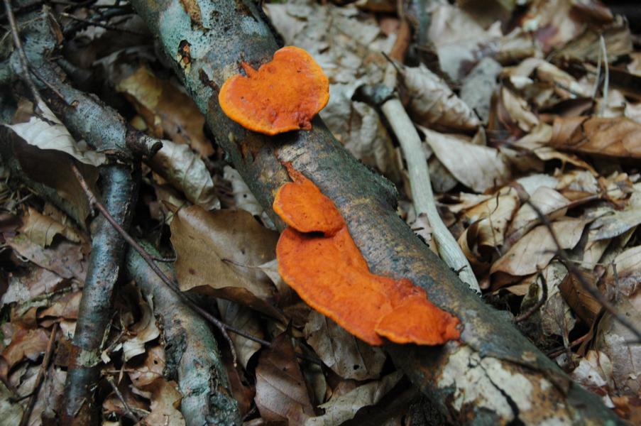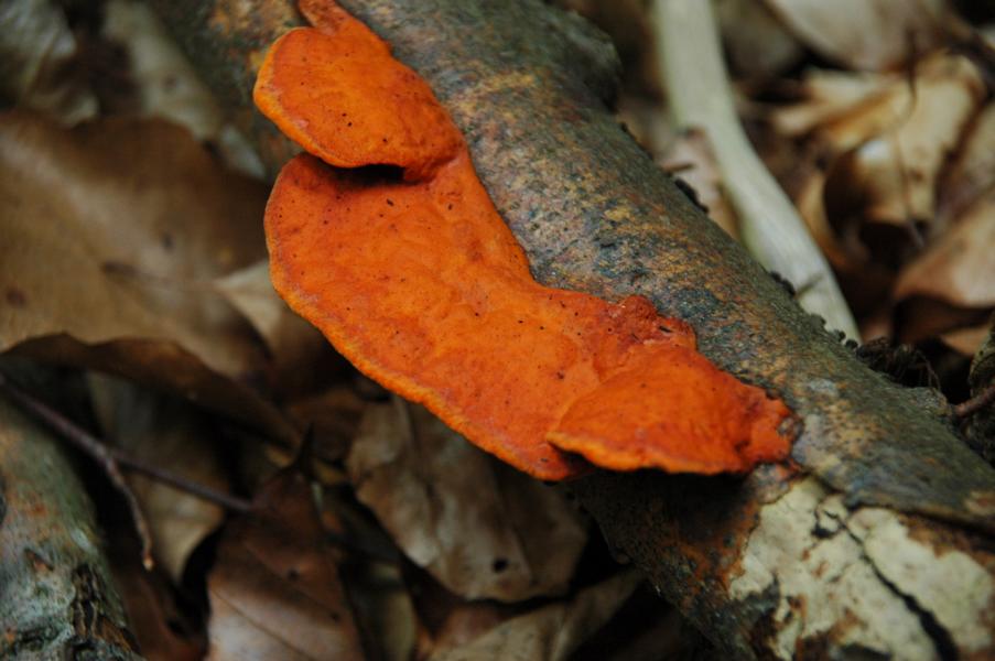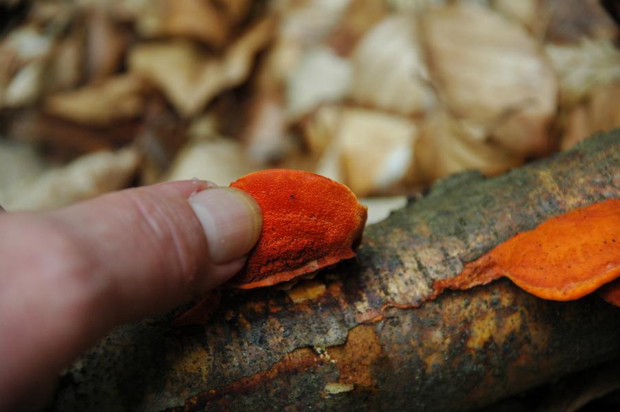 Ich denke, Alex meint nur, daß auf den Bildern nicht viel zu erkennen ist. Aber diese Strahlkraft und die typischen Farben sowie Habitus passen schon sehr gut zum von Michael vorgeschlagenen Zinnoberporling (Pycnoporus cinnabarinus). ![]()