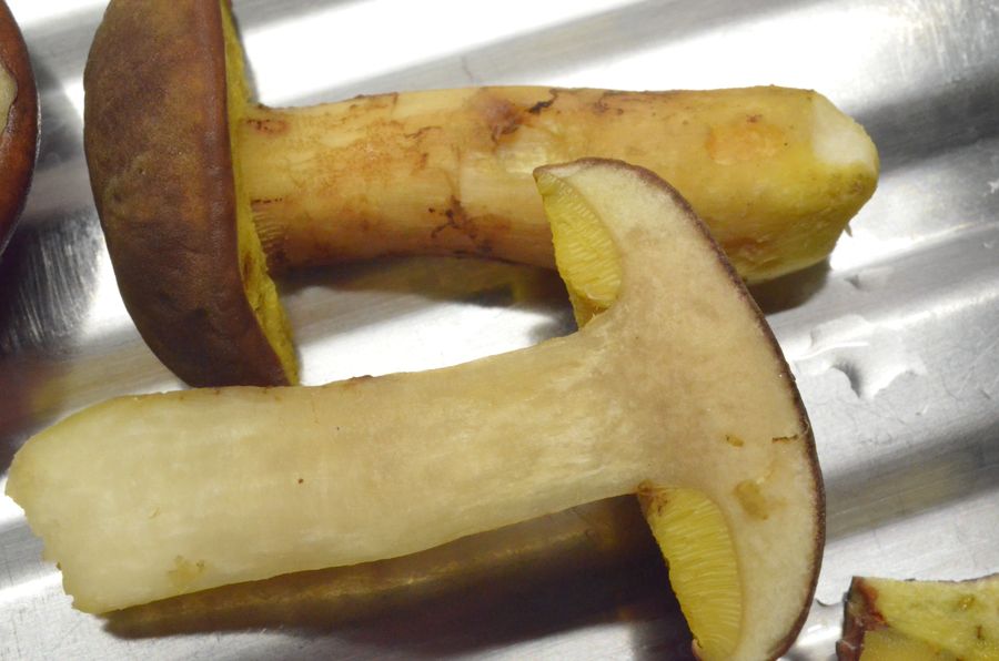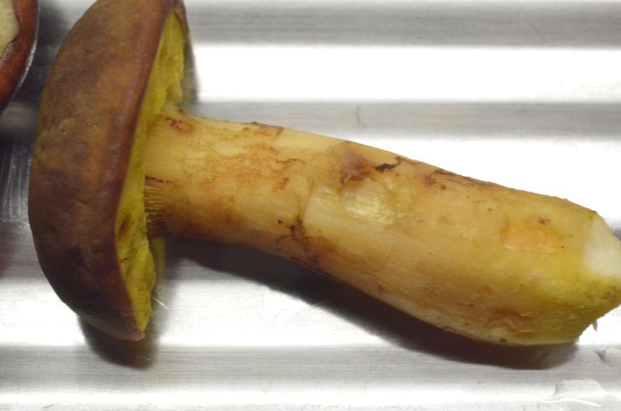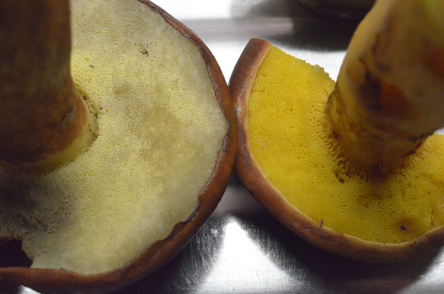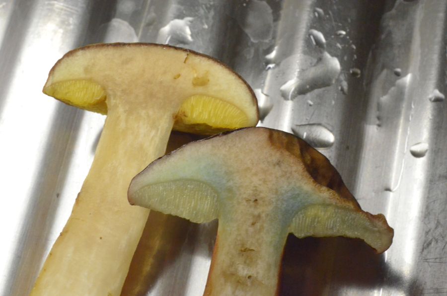 Hier rechts die Marone, die frisch angeschnitten blaut, danach ins schwach rötlichbraune blendet.