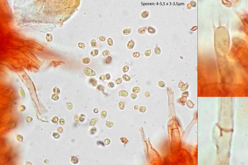 Sporen glatt, 4-5,5 x 3-3,5 µm, die eine große Ausnahmespore im Bild war 7 µm lang.