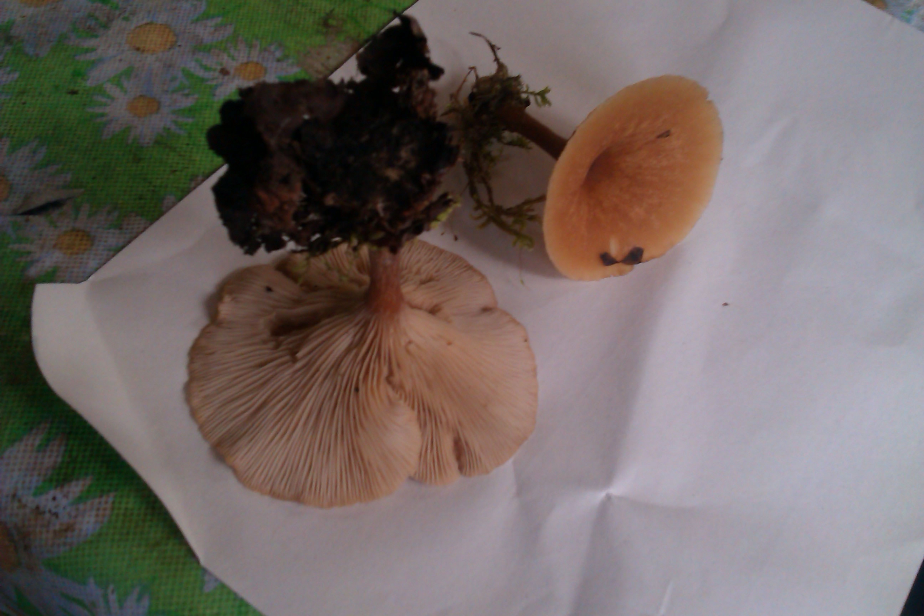 Wie gesagt, ich tippe auf einen Trichterling. Da gibt es sehr viele Arten, sowohl harmlose wie z.B. den ockerbraunen Trichterling - siehe z.B. hier: