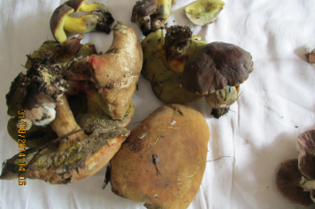 4. stark nach Steinpilz riechend, mir völlig unbekannt, es könnten auch 2 unterschiedliche Arten sein, vom Duft her beide gleich. Wobei die im ersten Bild links deutlich von Aussehen der rechts und rechts oben abweichen. Der feste dunkle Kappe, die anderen Kappen sind eher sandfarbend. Das letzte Bild zeigt nochmal einen der Pilze mit dunkler Kappe von unten.