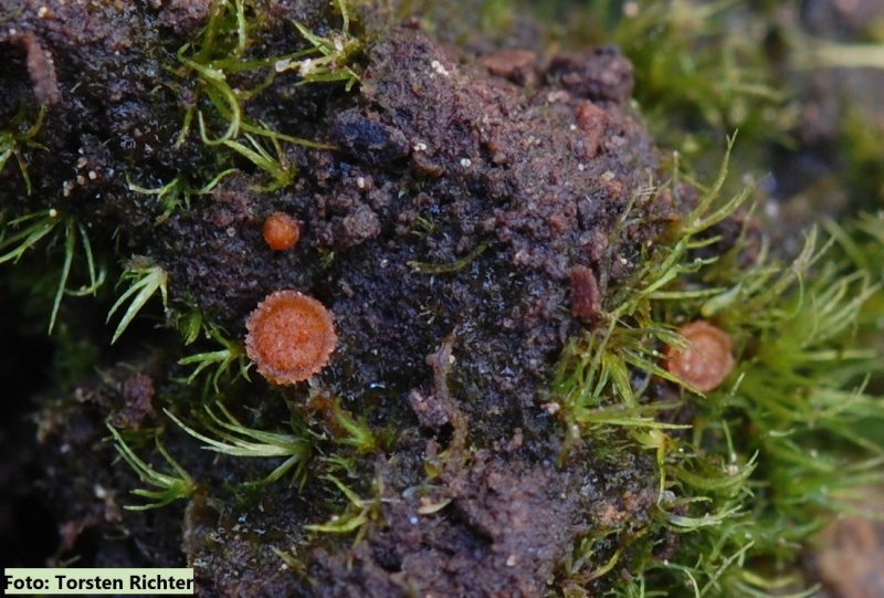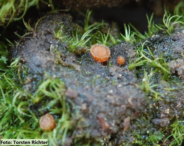Lamprospora campylopodis wächst auf saurem Untergrund und parasitiert an dem Moos Campylopus pyriformis.