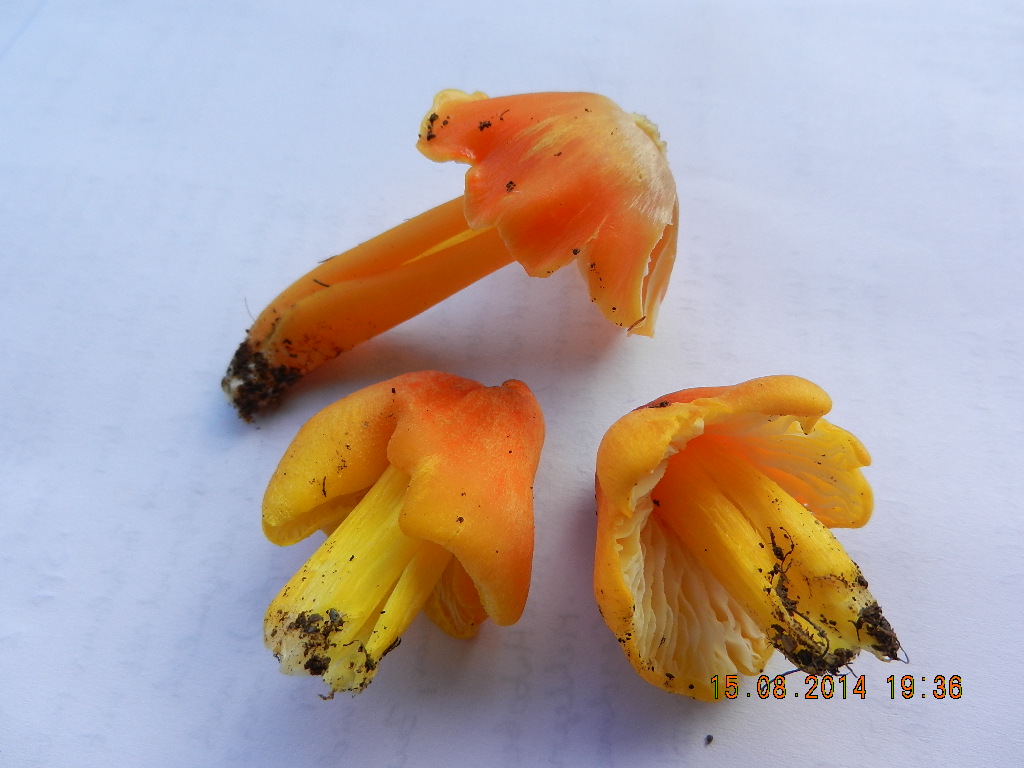 Ihr habe erkannt, dass Hygrocybe conica 2 Stunden nach dem Fund längst grau verfärbt hätte sein müssen, dass es also dieser Saftling nicht sein kann. Das feuerflammende Farbenspiel in Verbindung mit trockenem Hut und Stiel und fehlendem Grauen/Schwärzen passt dagegen auf H. intermedia, den ich natürlich auch mikroskopiert habe
