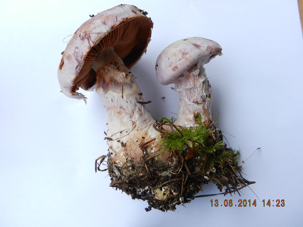 Pilz 2: Cortinarius traganus (Lila/Safranfleischiger Dickfuß); an den vor Feuchtigkeit glasigen Stellen war das safranfarbige Fleisch zu erahnen, ferner ist der Velumüberzug des Pilzes rosaviolett und nicht blauviolett wie bei den anderen Dickfüßen