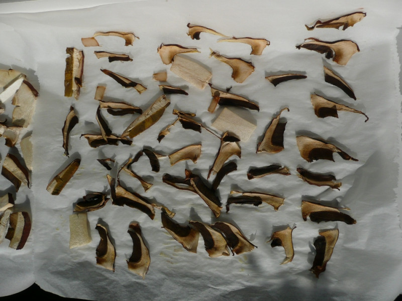 Nach 3-4 Tagen die mit Steini-Scheibchen ausgelegten Backpapiere (ein Backpapier pro Trockenvorgang) im Backofen bei ca. 50 °C Umluft je nach Backofen, (die Ofentüre muss aber unbedingt einen Spalt d.h. ca. 3 cm offen bleiben!), allerhöchstens noch 30 Min. fertig trocknen.