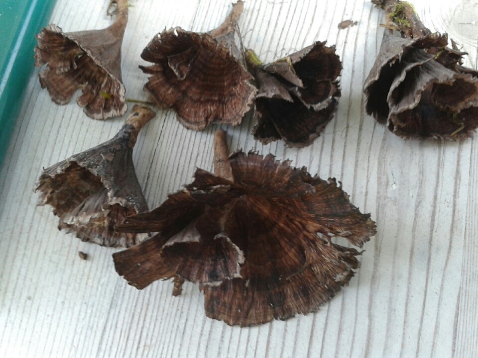 Auf zu meinem Geheimplatz, der so geheim ist, dass ich ihn bei der letzten Tour selbst nicht mehr wiedergefunden habe. Zum Glück hatte ich im letzten Herbst das Navi dabei und habe sogar einen Wegpunkt mit Namen "Erz" gesetzt. Erzvorkommen in Brandenburg? Nach etwas Grübeln komme ich auf EdelReiZker. Die Stelle ist diesmal also einfach gefunden, alles da - außer die Pilze, die ich dort erhofft hatte. Kein Reizker, kein Grünling (nein, ich esse ihn nicht), kein Habichtsstacheling. Stattdessen Schmierröhrlinge und Maronen im biblischen Alter und etwas, was ich (ohne Pilzbuch unterwegs) in die Verwandschaft der Lederkorallen (Thelephora) stellen würde. Zuhause bleibe ich dabei, allerdings nicht die Stinkende, die mir als Färbepilz willkommen gewesen wäre, sieht eher nach dem Trichter-Warzenpilz aus. Kann jemand bestätigen?
