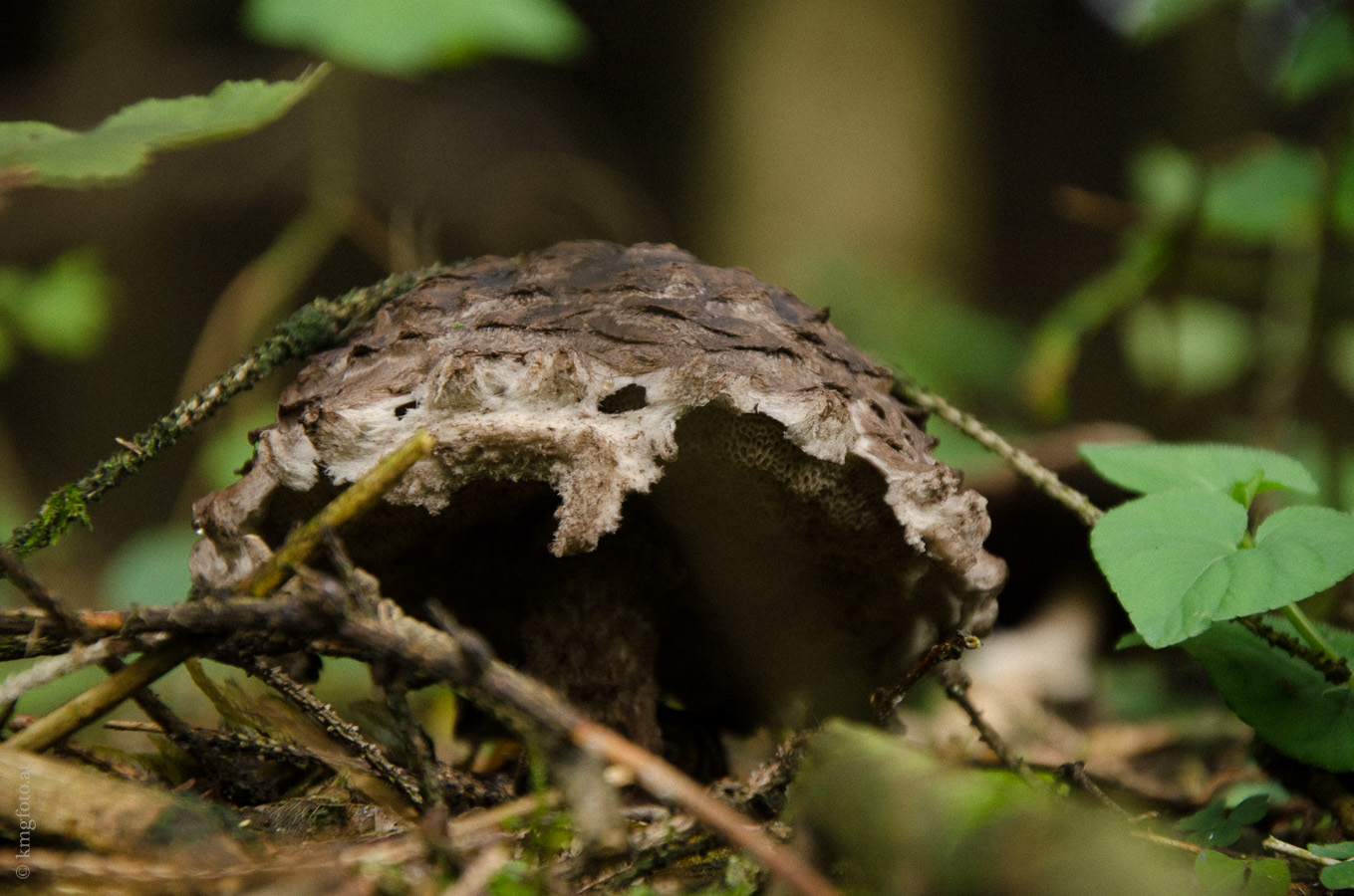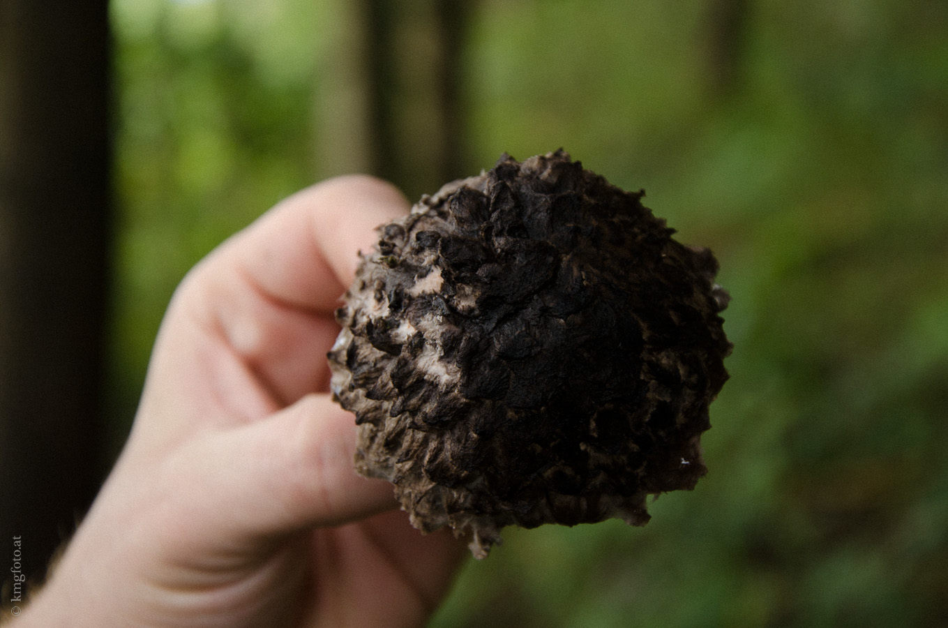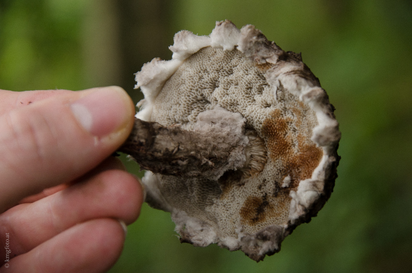 Diesen haben wir als Strobilomyces Strobilaceus / Strubbelkopfröhrling identifiziert. Man sieht die breiten Röhren, die sich wie das Fleisch, erst schmutzig rötlich und dann später dunkel verfärben.