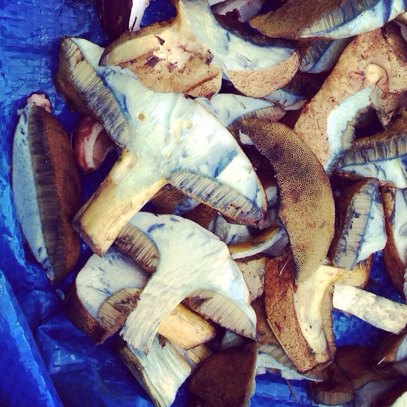 Beim aufschneiden färbt sich der Pilz sofort blau! Das kann man gut an den Pilzen auf dem Blech sehen (es sind auch ein paar normale Maronen drunter).
